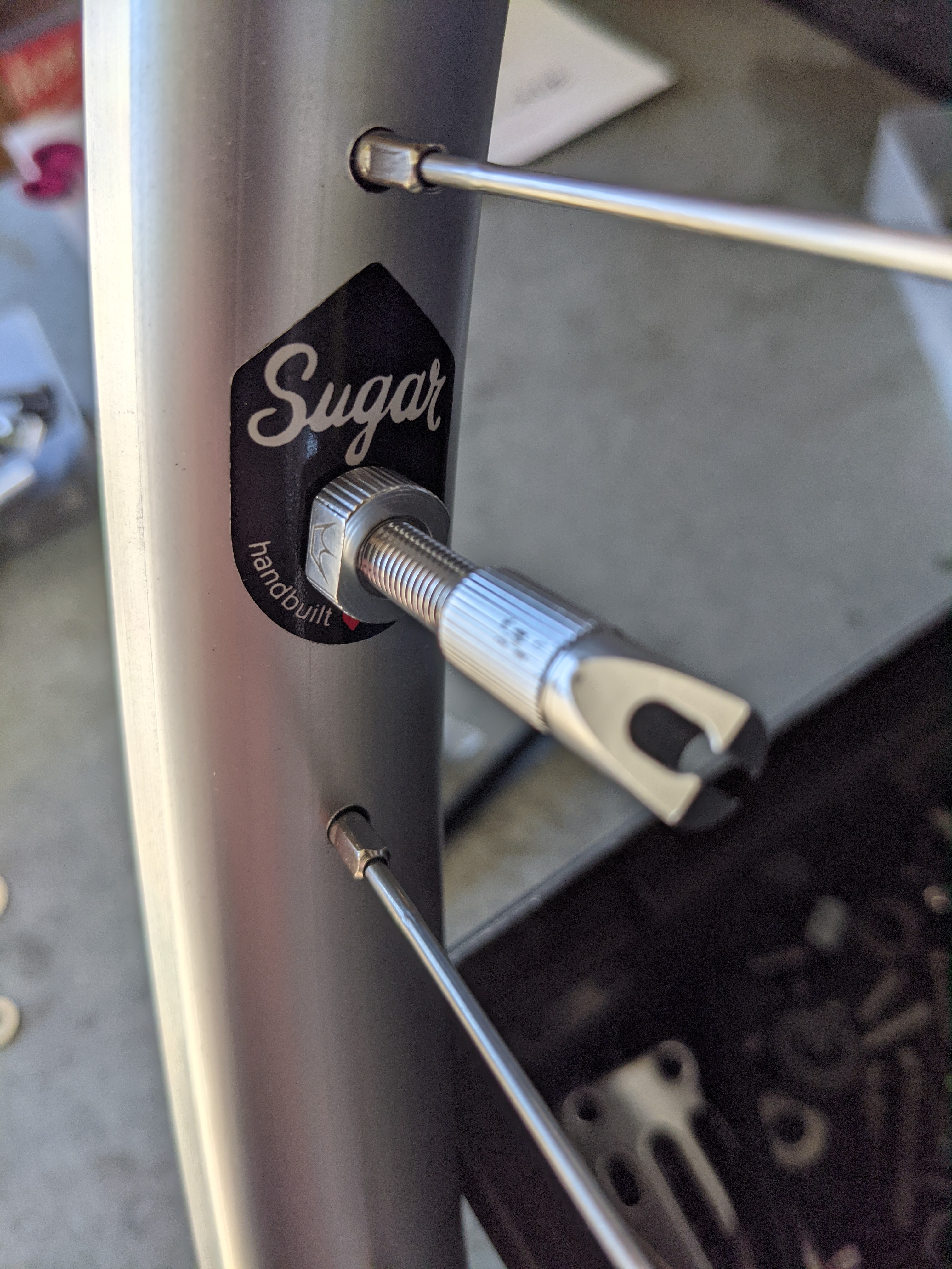 Now with the wheels. I reached out to Sugar Wheel Works in Portland, Oregon for a custom set of 29er wheels. They built me a set of Velocity Cliff Hangers with a 25mm internal width.