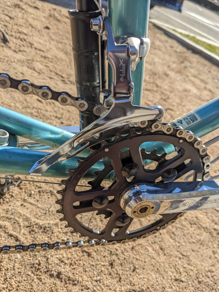 I’m running a 9-speed Shimano XT rear derailleur and a first-gen XTR front derailleur. Swapped out the very capable Silver cranks for the set I had already purchased, a beautiful White Industries square taper crankset with a 24/38 set o’ rings.