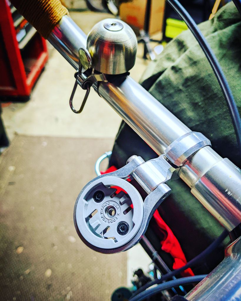 Wrapped and shellacked the bars with orange Newbaums, slapped the best bell ever (Spur Cycle Original) on it and that’s it. I’ll touch on the computer holder a little later here.